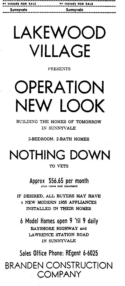 This classified advertisement for Lakewood Village homes first appears in the Sunnyvale Standard newspaper.