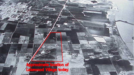 This aerial view was photographed sometime in the 1940’s. The approximate location of Lakewood Village is marked by the red outline. To the left (south) is what has