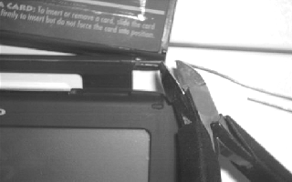 Thread the wire through the flip-cover cavity, through the hole you drilled in the flip-cover, through the hole you drilled out in the main body hinge, and into (but not through) the opposite hole in the main body hinge (see photo, below). Since you'll need to slightly bend the wire as it threads through the flip-cover cavity, you may find helpful to rotate the wire as you thread it. Be gentle and don't force the wire.